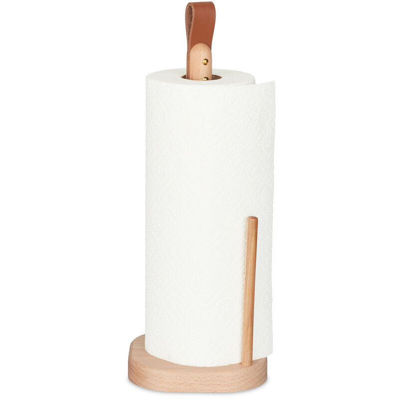 I guai in cucina capitano spesso: si rovescia un bicchiere, il sugo schizza sui fornelli e la panna straborda dalla ciotola. Grazie al cielo sai dove si trova la carta assorbente! Grazie al design pratico con barra ferma-rotolo, in legno, potrai comodamente strappare un foglio con una sola mano e pulire subito la sporcizia. La sua ampia base con gommini antiscivolo lo rende stabile ed evita che le superfici si graffino. Il supporto è compatibile con rotoli scottex standard. Porta rotoli da cucina in dettaglio - Misure H x L x P: 35 x 13 x 13 cm ca. - Peso: 350 g ca. - Materiale: legno di faggio, pelle - Colore: tonalità naturale del legno, marrone Portarotolo per carta assorbente - Supporto per rotoloni di dimensioni standard di carta da cucina - La piccola barra laterale impedisce che la carta inizi a srotolarsi da sola - Per conservare la carta assorbente in un posto preciso e averla a portata di mano - Il portacarta è verticale, pensato per essere appoggiato sul piano di lavoro