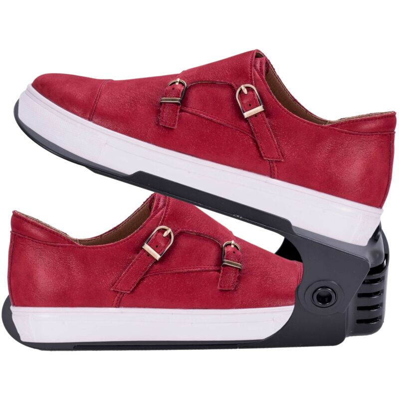 Portascarpe regolabile porta organizer nero Scopo: organizzare le scarpe | Colori: nero Il supporto si adatta a tutti i tipi di scarpe: scarpe da ginnastica, tacchi alti, ecc. Occupando poco spazio, aumenta notevolmente lo spazio di archiviazione impilando le scarpe una sopra l'altra. Perfetto per organizzare le scarpe di tutta la famiglia. Caratteristiche del prodotto Per tutti i tipi di calzature Realizzato in plastica resistente e flessibile Grazie all'organizer le scarpe non si sporcano impilandole Costruzione leggera Risparmia spazio del 50% Superficie antiscivolo Limitatore Pratica maniglia Regolazione in 4 fasi Dimensioni prodotto Lunghezza totale 25 cm Larghezza totale 9,7 cm Altezza totale 18 cm Regolazione in 4 fasi! Livello 1 - 8 cm Livello 2 - 11 cm Livello 3 - 15 cm Livello 4 - 18 cm Ricordati di separare i rifiuti! Informazioni aggiuntive I colori mostrati sono solo a scopo illustrativo: potrebbero differire da quelli reali a causa delle diverse impostazioni del monitor