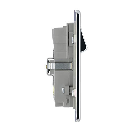 Presa di alimentazione a doppio interruttore senza viti con linea sottile cromata lucida. Da BG Electrical, ha angoli leggermente arrotondati con una piastra piatta senza viti, dando un look pulito che trasuda eleganza moderna