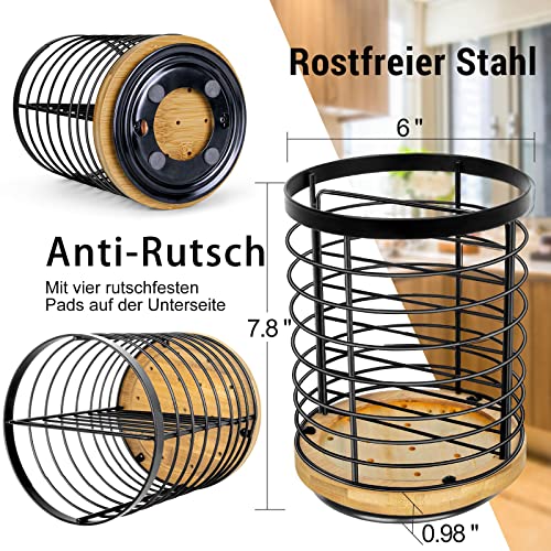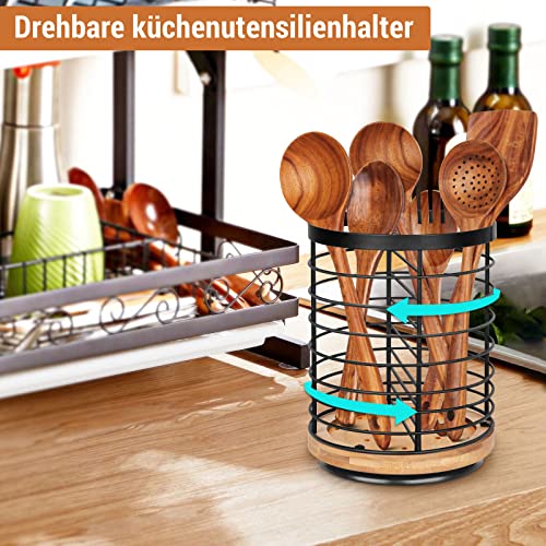 Portautensili da cucina, porta utensili da cucina, in acciaio inox nero + base in legno, traspirante e facile da asciugare + supporto girevole per utensili da cucina