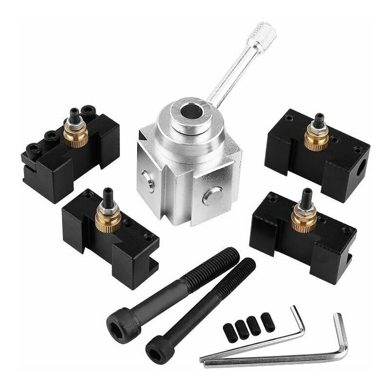 Set di portautensili di cambio - Il set di portautensili e portautensili a cambio rapido è l'accessorio principale del comune mini tornio. Consiste in un portautensili e diversi portautensili. Multifunzione: utilizzare il portautensili appropriato in base alle esigenze del pezzo. Possono essere utilizzati per tornitura, sfacciatura, taglio, zigrinatura, foratura e alesatura, alesatura, ecc.Alta precisione: il cambio utensile implementa l'installazione esterna della fresa ed è caratterizzato da cambio rapido, alta precisione ed elevata rigidità. utensile per sostituire i tradizionali utensili quadrati e fornire una tornitura rapida.Ampiamente utilizzato: ampio montaggio, questo set di portautensili e portautensili può essere utilizzato per molti tipi di mini torni.