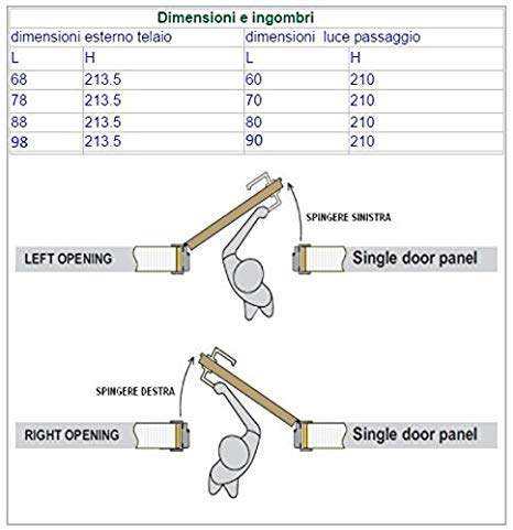 ATTENZIONE: Per le misure di ingombro esterno telaio vedi tabella/foto allegata ANTA (spessore mm 44) costituita da telaio perimetrale in legno abete giuntato essiccato e trattato anti tarlo, nido d'ape in cartoncino resinato con cella da mm. 22 supporto da mm. 4 nobilitazione in laminatino doppia battuta.