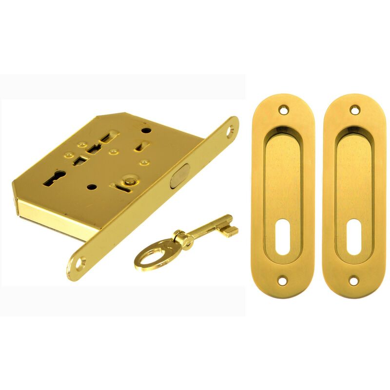 Composto da: - serratura solo chiave entrata 50 mm - coppia nicchie in ottone mm 30x85 con foro chiave - chiave snodata -nicchia di trascinamento ¦ 25 mm finitura lucido verniciato