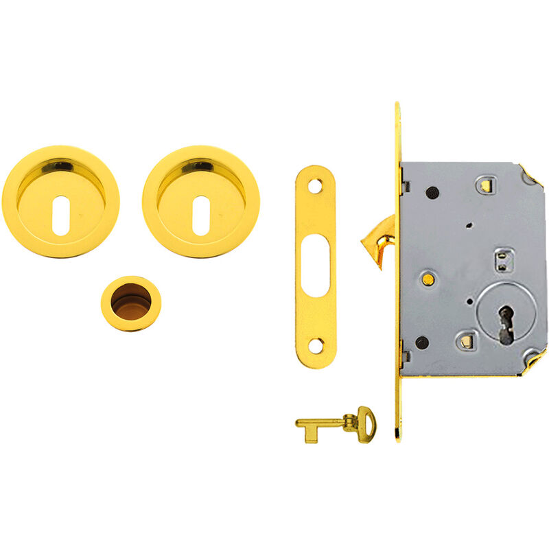 Composizione: coppia nicchie tonde mm 48 con foro chiave, nottolino Ø 25 mm, serratura solo quadro entrata 50 mm, chiave snodata.