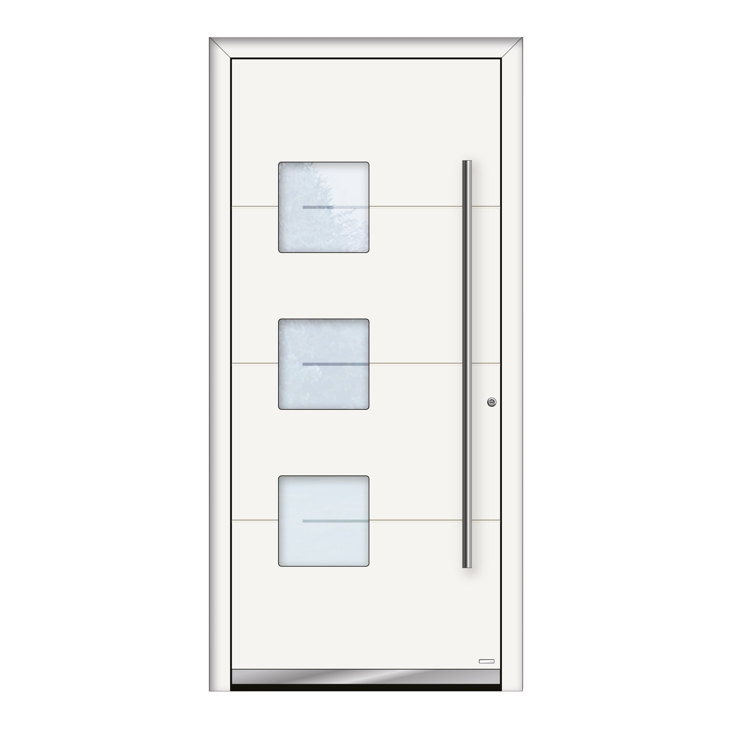 Questa combinazione gioiosa e giocosa data da tre finestrelle quadrate arricchisce una casa di per sé già felice. Per i giovani di spirito. L'elegante maniglione in acciaio inossidabile non fa altro che esaltarne lo splendore.. Porte di sicurezza solide per case, appartamenti, uffici e altro.. Questo è il settore di competenza in cui le porte Aurum brillano. Il loro spessore è addirittura di 8,7 cm, il che non offre solo una piacevole sensazione di sicurezza ma anche un'elevata protezione alle variazioni di temperatura.. Grazie all'incredibile isolamento termico Aurum si posiziona tra le porte adatte a case a basso consumo energetico. Il livello di sicurezza viene ulteriormente aumentato dalla serratura a tre punti con tre solidi ganci.. La robusta struttura in acciaio non richiede manutenzione per i prossimi decenni. È composta da profili in alluminio a 3 guarnizioni montati in modo impeccabile che creano un solido blocco monolitico.
