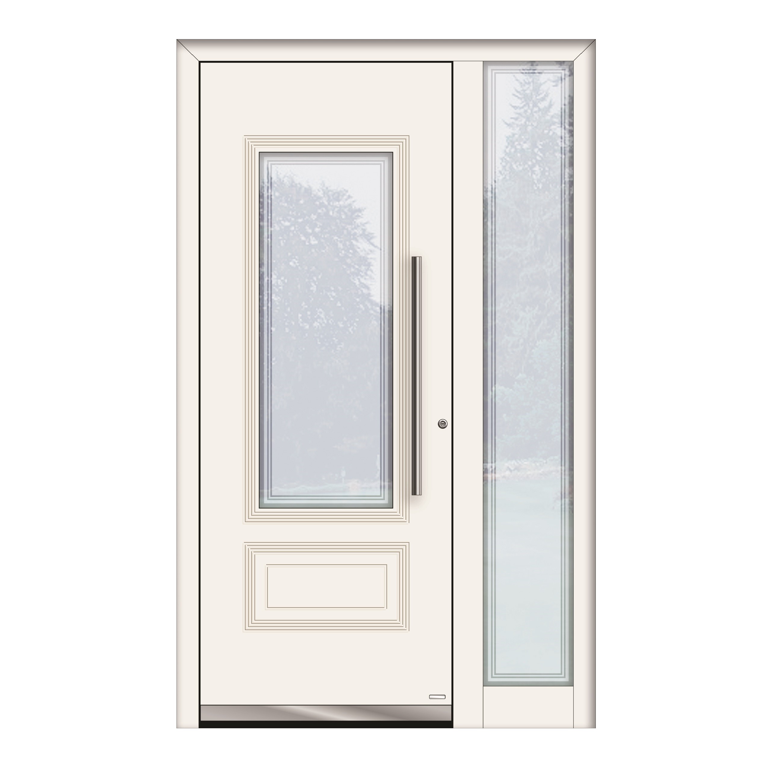 Questa porta rimanda al caldo e nostalgico sapore della tradizione. Le incisioni decorate donano molto a una struttura più datata dalle forme classiche. Solo il maniglione fa capire che si tratta di una porta resistente e tecnologicamente avanzata.. Porte di sicurezza solide per case, appartamenti, uffici e altro.. Questo è il settore di competenza in cui le porte Aurum brillano. Il loro spessore è addirittura di 8,7 cm, il che non offre solo una piacevole sensazione di sicurezza ma anche un'elevata protezione alle variazioni di temperatura.. Grazie all'incredibile isolamento termico Aurum si posiziona tra le porte adatte a case a basso consumo energetico. Il livello di sicurezza viene ulteriormente aumentato dalla serratura a tre punti con tre solidi ganci.. La robusta struttura in acciaio non richiede manutenzione per i prossimi decenni. È composta da profili in alluminio a 3 guarnizioni montati in modo impeccabile che creano un sol