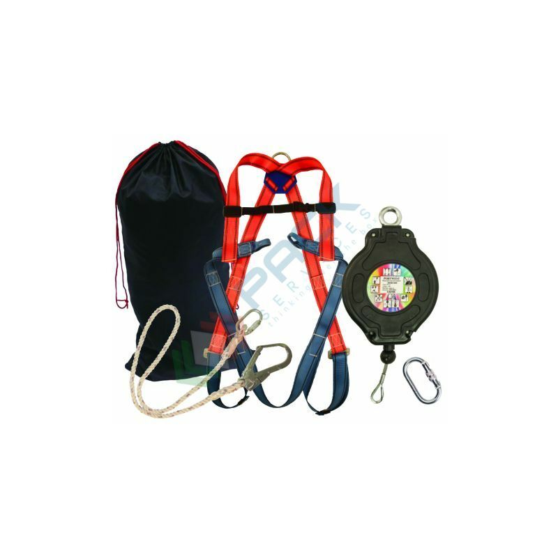 Imbracatura due punti di ancoraggio,-Arrotolatore anti caduta con cavo in acciaio,-Cordino singolo con moschettone e gancio da ponteggio,-Moschettone,-Borsa a tracolla in Nylon Certificato CE