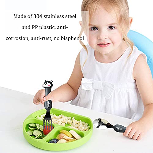 Posate per Bambini 2 Pezzi Set, Forchetta e Cucchiaio in Acciaio Inox, Posate Bimbi Toddler Utensili, Posate Viaggio Forchetta Custodia Portatile per Asilo Scuola Viaggio (Dog)