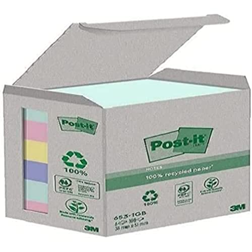 Post-it Foglietti in carta riciclata al 100% in colori assortiti, Confezione da 6 blocchetti, 100 Fogli per blocco, 38 mm x 51 mm, l'imballaggio può variare