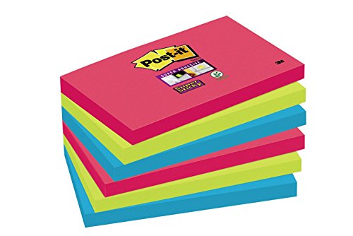 Post-it Super Sticky Foglietti, 90 Fogli, Confezione da 5 Blocchetti, 76 x 127 mm, Multicolore (Papavero/Verde Fluo/Blu)