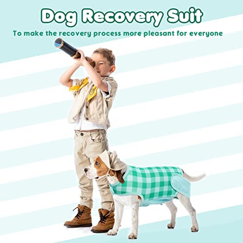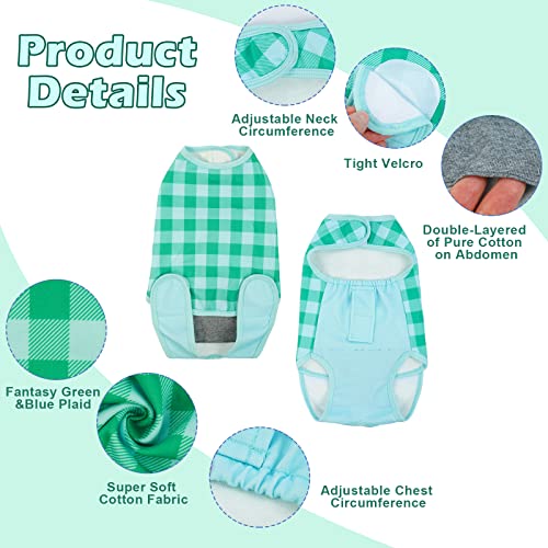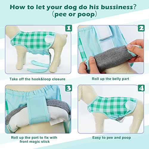 Design unico: questo set di ripristino è disponibile in due motivi, a quadretti blu cipria e a quadri verdi, carino ed elegante. Lunghezza schiena regolabile e nastro magico, possono aiutarti a indossare e togliere facilmente la tuta. Sulla pancia c'è spazio extra, in modo da poter riporre oggetti come un cuscino riscaldante. I vestiti possono essere arrotolati sotto la pancia e fissati con velcro, il che è conveniente per il cane per andare in bagno.