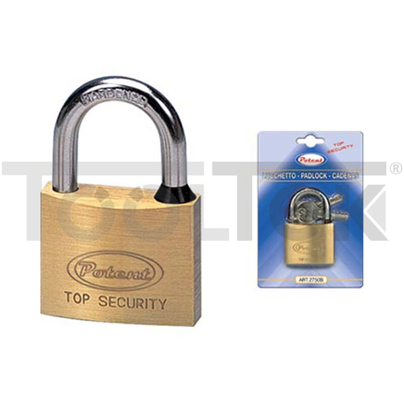 Lucchetti in ottone massiccio con corpo a spigoli arrotondati POTENT 2760B Arco in acciaio cementato e cromato con doppia ritenuta e rotazione di 360° Arco con guarnizione tenuta acquaMolla dell'arco inossidabilePistoncini di combinazione in acciaioRichiamo automatico della chiave nella posizione di estrazioneEstrazione chiave a lucchetto aperto o chiuso Forniti con 2 chiavi cromate Finitura ottone lucido verniciatoDimensioni: 60 mm Prodotto di qualità