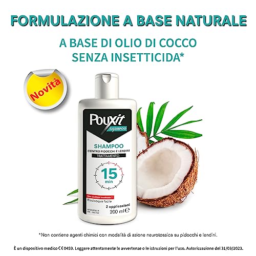 TRATTAMENTO ANTIPIDOCCHI E LENDINI SENZA INSETTICIDI: Pouxit Shampoo contiene olio di cocco (un agente naturale) che blocca gli orifizi respiratori ed escretori di pidocchi e lendini, uccidendoli in soli 15 minuti. Non contiene nessuna sostanza con modalità d'azione neurotossica poiché agisce per effetto meccanico.
