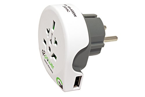 Q2 Power | 1.100110 | World to Europe USB | Adattatore Universale da Viaggio con Presa a Terra più Presa USB Tipo A con 2.1 A, Voltaggio e Potenza Max. 100V-1600W / 250V-4000W, Bianco/Grigio