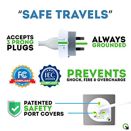Q2 Power 1.100130, World to United Kingdom USB Adattatore Universale da Viaggio con Presa a Terra più Presa USB Tipo A con 2.1 A, Voltaggio e Potenza Max. 100V-1300W / 250V-3250W, Bianco/Grigio