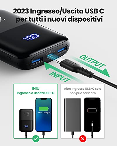 ✅【Ingresso e uscita USB C versione 2023】 A differenza della maggior parte dei caricabatterie dotati di un solo ingresso USB C, INIU PD 10000 ha una porta USB-C In & Out per adattarsi perfettamente ai tuoi nuovi iPhone, iPad e tutti i dispositivi USB-C in arrivo.