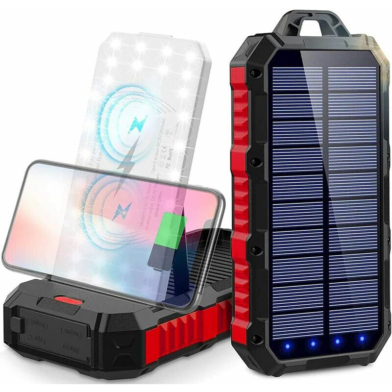 Grande capacità di 30000 mAh - : la banca di energia solare ha una capacità di 26800 mAh, che può essere utilizzata per iPhone 11* 8,6 volte, Samsung Galaxy 10* 7 volte, iPad Air* 3 volte. La ricarica cablata è compatibile con la maggior parte dei dispositivi elettronici e compatibile con i modelli di telefoni cellulari che supportano la ricarica wireless, fornendo un'ampia gamma di compatibilità. 【Ricarica wireless QI + 3 porte di uscita】: 3 porte di uscita USB e dispositivi supportano la ricarica wireless, come iPhone 8/11/X/XS Max, Huawei Mate30 Pro/P30 Pro, Galaxy Note 10/Galaxy S9, ecc. Ricarica fino a 4 dispositivi contemporaneamente e condividi con la tua famiglia per risparmiare tempo. La porta USB va inserita normalmente, non forzarla a piacimento. In caso di danni, contattaci. 【Due modalità di ricarica】: la banca di energia solare può caricare la batteria da sola al sole e, con un cordino, può essere facilmente appesa allo zaino per assorbire completamente la luce solare. ⚠