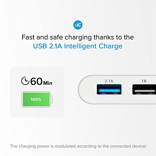 Tecnologia intelligent charge: l'uscita USB da 2.1 a è in grado di riconoscere la potenza massima assorbibile dal device e la regola di conseguenza, evitando rischi di surriscaldamento o sovraccarichi