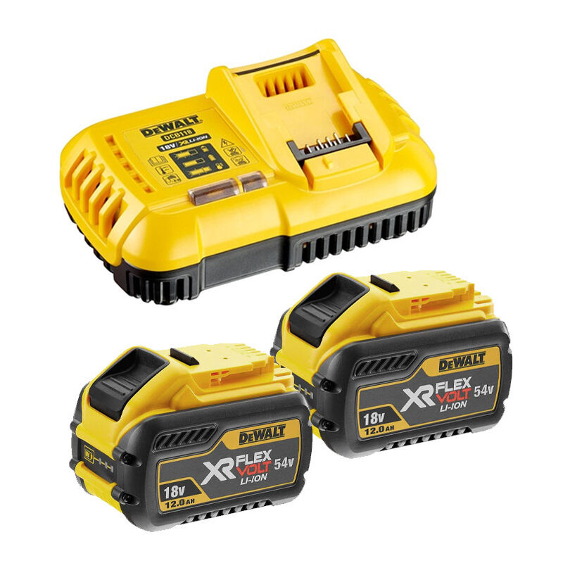 Power Set DeWALT FlexVolt DCB118Y2 Batterie DeWALT DCB548 54V/18V 12,0 Ah - Tecnologia XR FlexVolt: offre autonomia e prestazioni mai viste prima, gli utenti professionali possono intraprendere in modo affidabile applicazioni di costruzione pesanti senza la necessità di energia - Tensione flessibile 18 V o 54 V per una potenza senza pari - Compatibile con tutti gli strumenti e i caricabatterie 18R e 54V XR Caricabatterie DeWALT DCB118 - Caricabatterie intelligente: varia la corrente di uscita in base alla batteria - Indicatore LED che comunica lo stato della carica della batteria: carica, ricarica, problema di alimentazione e batteria troppo calda o troppo fredda - Dimensioni compatte per una facile memorizzazione - Possibilità di montaggio a parete