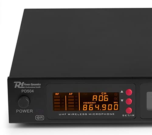 Power Dynamics PD504B - Set Radiomicrofono 4 X 50 canali UHF senza fili, 4 x auricolare con microfono lavalier e trasmettitore bodypack, 4 x 50 canali UHF, PLL, custodia in alluminio