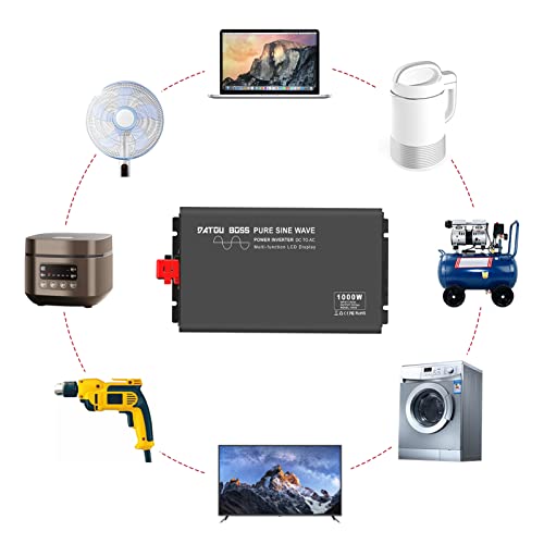 【Inverter 12v 220v Onda Pura 1000W】 Questo inverter di potenza fornisce 1000 watt di vera onda sinusoidale pura da DC 12V a AC 220V-240V di alimentazione continua. Inverter onda pura:alta efficienza, uscita stabile, tecnologia ad alta frequenza, può essere collegato a qualsiasi normale apparecchiatura elettrica senza alcuna interferenza. Soddisfare la domanda di elettricità del 99,99% dei prodotti sul mercato.