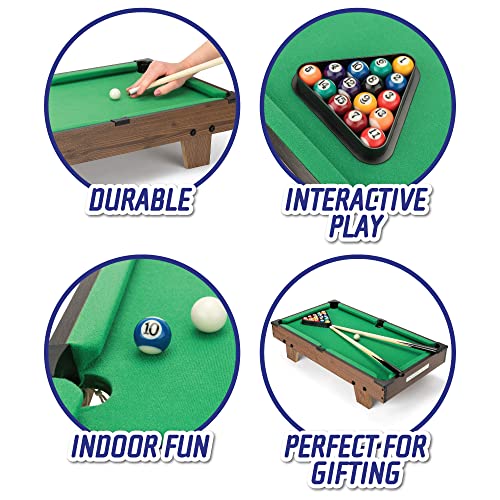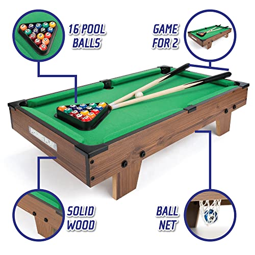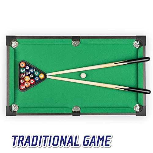 Set completo: Include tavolo da biliardo, due stecche in vero legno, palline da piscina con scatola portaoggetti, pennello, gesso e triangolo