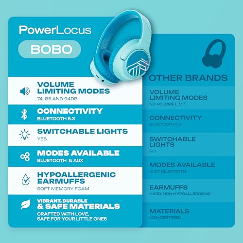 【Tripla modalità di limitazione del volume】- Cuffie wireless per bambini con limitazione del volume che assicurano un'esperienza di ascolto sicura e controllata. Le cuffie senza fili PowerLocus Bobo proteggeranno le loro orecchie delicate durante il viaggio e offriranno loro una gioia illimitata. La modalità bambino a 74 dB, la modalità studio a 85 dB e la modalità viaggio a 94 dB li farà divertire in modo responsabile.