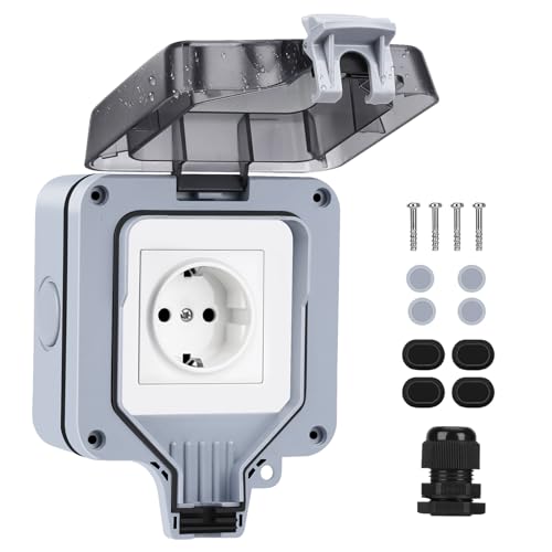 Powerole Presa esterna IP66 resistente alle intemperie, presa da parete da giardino, a parete, contatto di protezione per ambienti umidi, giardino, esterni, presa esterna (1 presa esterna)