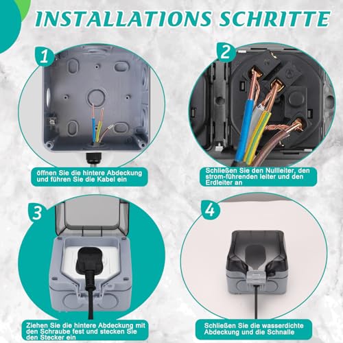 Facile da installare: molto adatto per tutti i dispositivi esterni, facile da smontare e installare. È possibile aprire la presa, collegare il cavo al connettore e quindi ricollegarlo. Grazie all'ingresso del cavo, è possibile ottenere una sezione trasversale del cavo di 2,5 mm² - lo spazio di cablaggio più grande offre spazio sufficiente per tutti i cavi necessari.