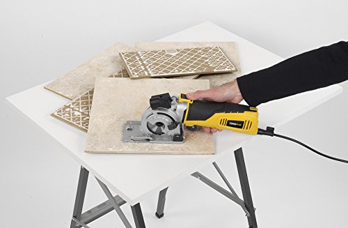 Dotazione: mini sega circolare portatile, lama con denti di metallo temprato (indicata per legno morbido, legno duro, pannelli di ogni tipo), lama diamantata (indicata per ceramica, piastrelle), lama in acciaio rapido HSS (indicata per metalli morbidi, alluminio), tubo flessibile per l'aspirazione della polvere, chiave esagonale, spondina, piastra base, manuale di istruzioni