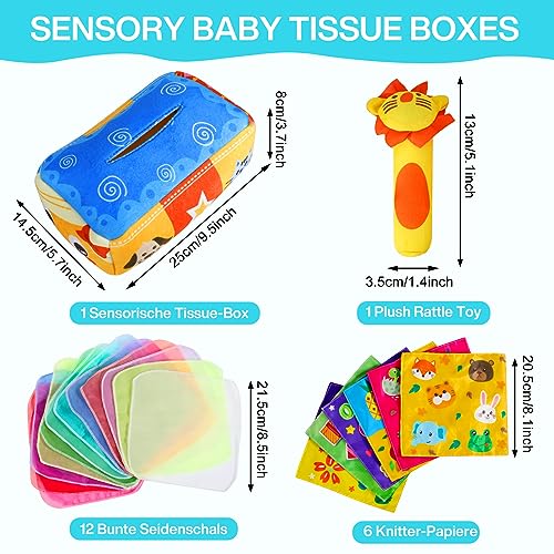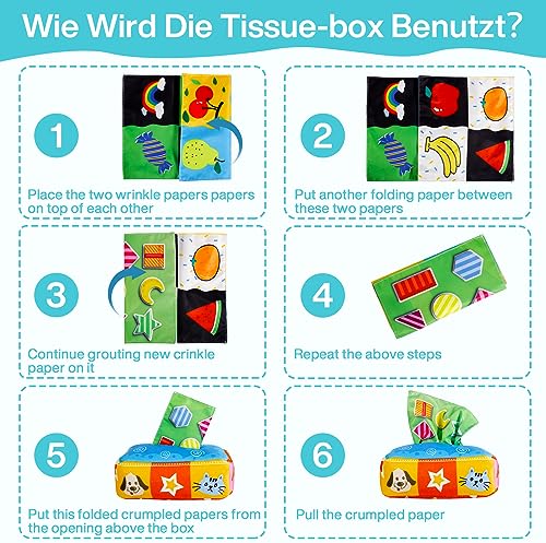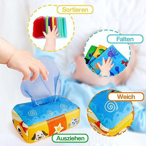 【✅ Giochi per Bambini】 La Scatola Magica dei Fazzoletti è un giocattolo sensoriale ideale per il precoce sviluppo dei neonati e dei bambini. I piccoli adorano tirare fuori i fazzoletti dalla scatola uno per uno, quindi abbiamo creato questo sicuro e divertente giocattolo che simula il comportamento dei bambini. La scatola dei fazzoletti sensoriali intrattiene i bambini e promuove le loro abilità sensoriali tramite texture coinvolgenti, suoni stimolanti e riconoscimento dei colori.