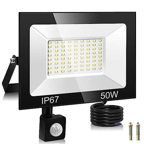 PPSSOHU 50W Faretto LED da Esterno con Sensore di Movimento, 72 Leds 5000LM 7000K Bianco Freddo Faretto Led Esterno IP67 Impermeabile Faro LED con Sensore di Movimento per Garage Cortile