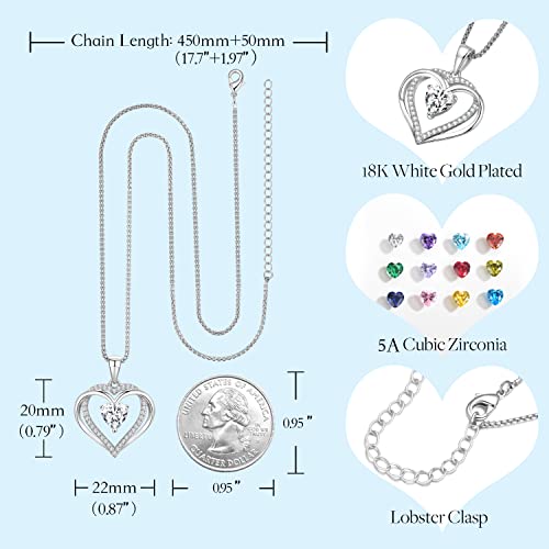 Praelinos Collana Donna Amore Cuore Birthstone Collana Ciondolo Placcato Oro Bianco Carati 5A Zirconia Cubica Regali per Mamma Moglie Lei Fidanzata Anniversario San Valentino Compleanno(Bianco)
