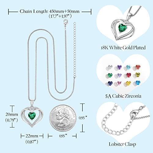 Praelinos Collana Donna Amore Cuore Birthstone Ciondolo Placcato Oro Bianco 18 Carati 5A Zirconia Cubica Gioielli Regali per Mamma Moglie Fidanzata Anniversario San Valentino Compleanno(Verde)