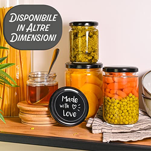 SET DI 25 BARATTOLI CON COPERCHIO A VITE: Capacità: 230 ml | Materiale: Corpo in vetro | Coperchio a vite in metallo | Colore: Coperchio Nero "Made with Love" | ø 6,5 cm.