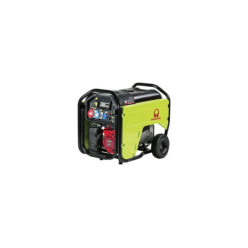 Generatore di corrente, S 5000 AVR, benzina, Honda GX270 E-Start, 230/400 V, 3,1 / 4,3 kW. Fornitura = montato. Lunghezza = 840 mm. Larghezza = 615 mm. Altezza = 753 mm. Tipo di tensione = flusso luminoso e corrente trifase. Tensione = 230 / 400 V. Frequenza = 50 Hz. Cilindrata = 0.27 m³. Capacità serbatoio = 27 l. Livello di pressione acustica = 69 dB(A). Tipo di presa = 1 da 230 V CEE 16 A, 1 da 230 V CEE 32 A, 1 da 400 V CEE 16 A. Tipo di motore = benzina. Potenza motore = 3.4 / 5.0 kW. Potenza nominale = 3.1 / 4.3 kW. Tempo di funzionamento con output al 50% = 16.27 ore. Dotazione = regolatore di tensione automatico (AVR). Tipo di prodotto = generatore elettrico. Regolazione automatica della tensione (AVR). Comoda funzione di avviamento elettrico. Versione robusta, dall'eccezionale durata per un utilizzo continuo. Motore industriale Honda OHV di lunga durata. Display digitale multifunzione (contaore di funzionamento, tensione e frequenza). Regolazione automatica della tensione