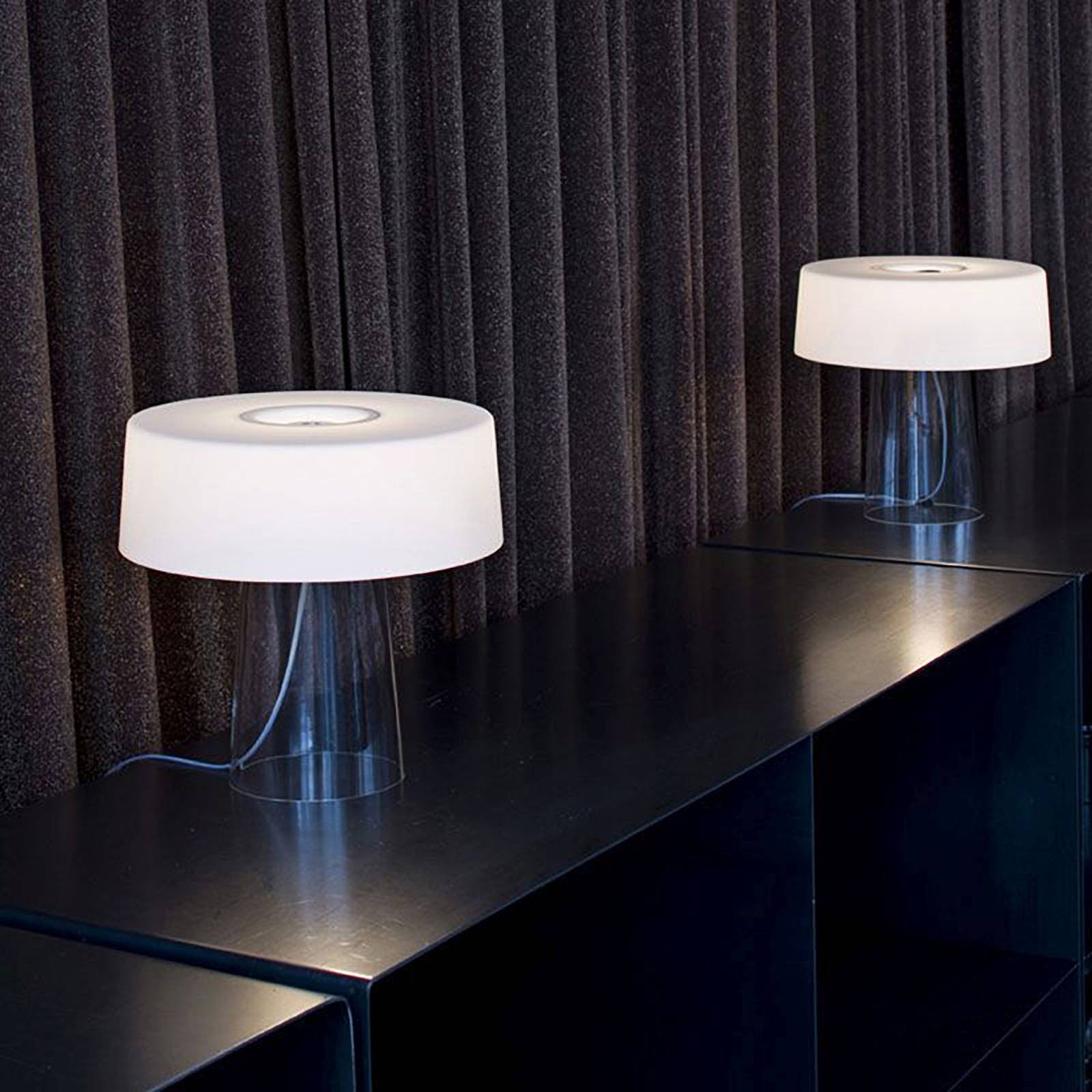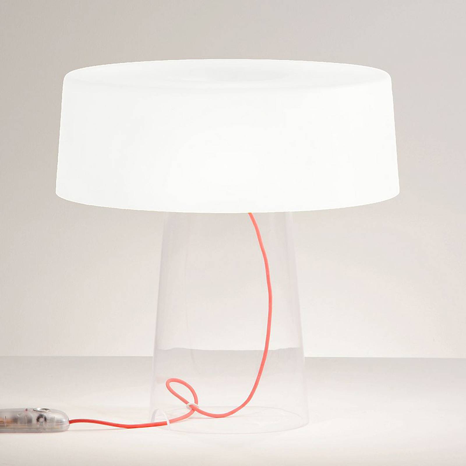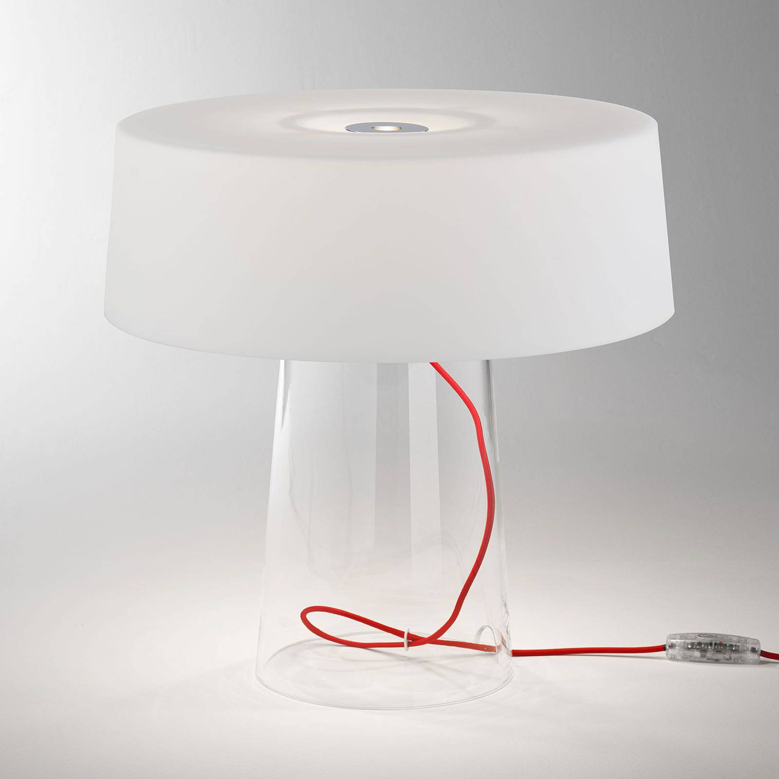 Lampada da tavolo Glam - completamente in vetro soffiato a bocca con dimmer La lampada da tavolo Glam è una fonte di luce che crea una sensazione, sia su un tavolino in salotto che in un ufficio prestigioso o nella hall di un hotel. È interamente costituita da vetro soffiato a bocca. Mentre la base è mantenuta trasparente, il paralume è stato progettato colorato e opacizzato per ridurre il riverbero degli illuminanti e per garantire una radiazione luminosa uniforme e creare un effetto di contrasto. Anche il cavo, rivestito di rosso, spicca e dà carattere all'apparecchio. Luc Ramael ha progettato la lampada da tavolo Glam, che ancora oggi emana il suo fascino. Il designer belga crea mobili e lampade che si presentano come oggetti utili senza inutili fronzoli. Il produttore di questa affascinante lampada da tavolo Glam in vetro è Prandina, un'azienda fondata da Sergio Prandina nel 1982. I prodotti del produttore hanno un alto valore di riconoscimento grazie al design unico dei loro paralumi, realizzati principalmente in vetro soffiato a bocca. Prandina collabora con designer e architetti di fama mondiale.