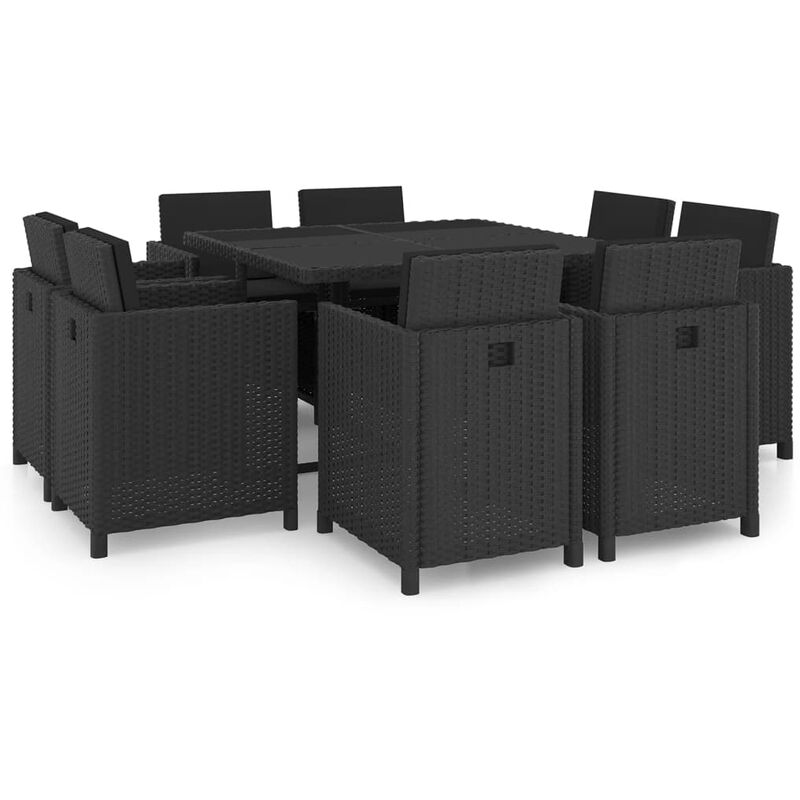 Le nostre lussuose sedie da giardino in rattan diventeranno il punto focale del vostro giardino o del patio! Questo set da pranzo, con un design elegante, sarà una fantastica scelta per tutti i pranzi all'aperto o per rilassarsi in giardino. I telai in acciaio verniciato a polvere rendono il tavolo e le sedie resistenti e robusti e facili da spostare grazie alla struttura leggera. Realizzato in rattan PE resistente agli agenti atmosferici e con un piano superiore in vetro acidato, questo set da pranzo è facile da pulire. Gli spessi, soffici, cuscini imbottiti in schiuma dei sedili e degli schienali sono molto confortevoli e realizzati in poliestere idrorepellente. Le fodere estraibili e lavabili sono dotate di chiusura lampo. Inoltre, è possibile tirare giù lo schienale e riporre quattro sedie sotto il tavolo, risparmiando prezioso spazio quando il set non viene utilizzato. Nota: Si raccomanda di coprire il set durante pioggia, neve e gelo. Colore del rattan: Nero Colore cuscino: Nero