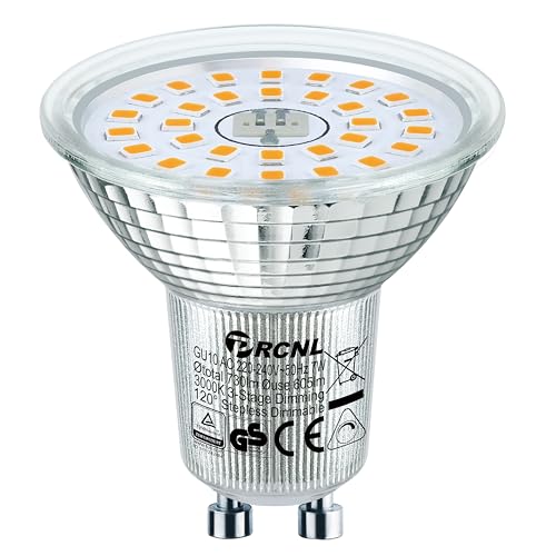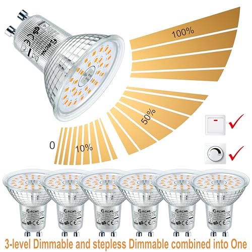 PRCNL GU10 LED Lampadine Dimmerabile 7W Bianco Calda 3000K 730LM Angolo a Fascio 120 Gradi, 6 Pezzi, Equivalente Lampadine Alogene 80W,Nessun Sfarfallio,Tre tipi di luminosità 3 in 1