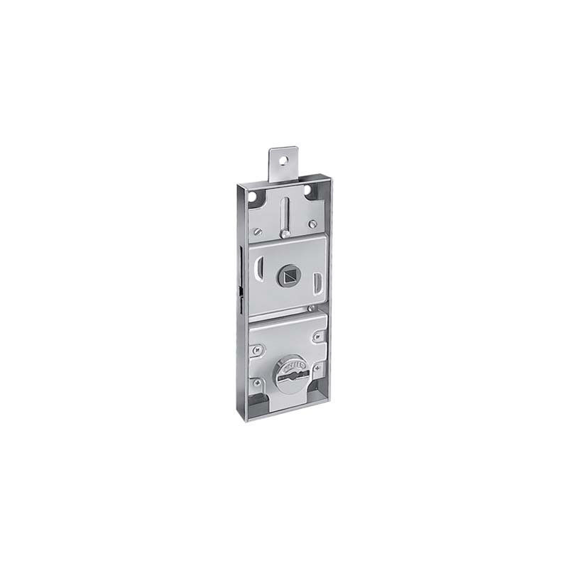 Con cilindro a doppia mappa a 5 gorges, da Mm. 25 di diametro. Verticale con chiusura singola lato superiore. Apertura con maniglia sia dall'estern... Con cilindro a doppia mappa a 5 gorges, da Mm. 25 di diametro. Verticale con chiusura singola lato superiore. Apertura con maniglia sia dall'esterno che dall'interno, sbloccaggio con chiave all'esterno e con levetta laterale e chiave all'interno. Corsa catenaccio Mm. 24. Quadro maniglia Mm. 8. Interasse Mm. 67. Scatola in acciaio zincato da Mm. 60x160, spessore Mm. 16,5. In dotazione: 2 chiavi.