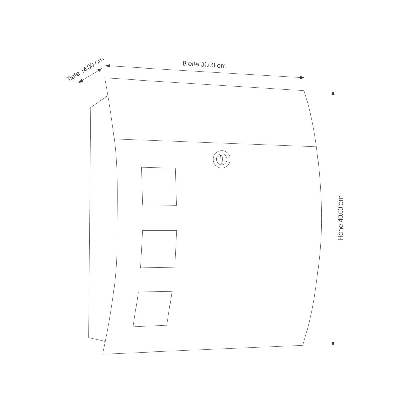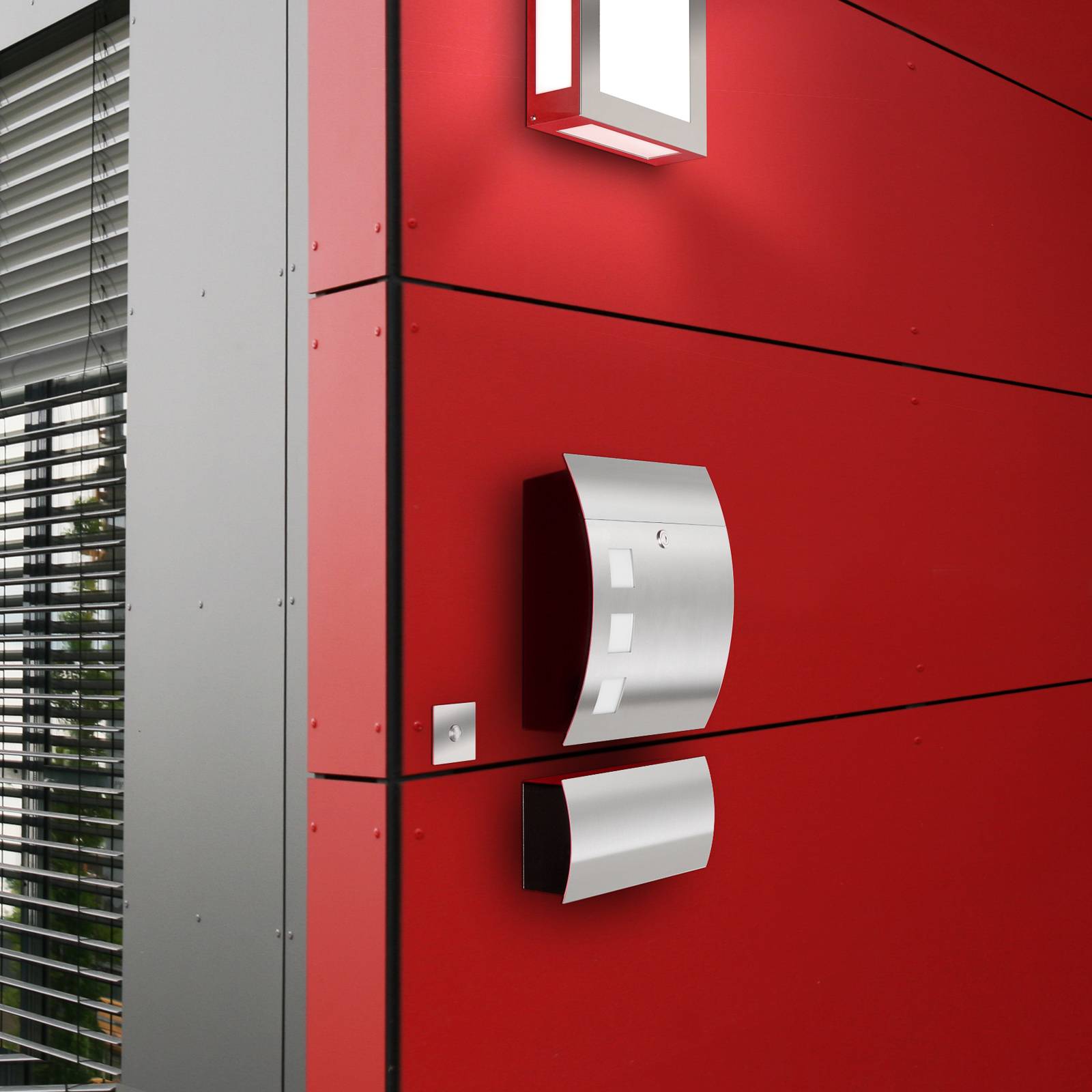 Pregiata cassetta postale Alani con pannello frontale in acciaio inox finemente spazzolato Di aspetto pregiato e decorativo, questa cassetta postale presenta un lato frontale in acciaio inox e una generosa apertura della buca. Tre ritagli quadrati caratterizzano l'elegante pannello frontale, completando al meglio il moderno design di questa casetta. Una lamiera in acciaio inox funge da doppio fondo, proteggendo dall'umidità le spedizioni più voluminose. I materiali di qualità e la loro accurata lavorazione caratterizzano i prodotti fabbricati in Germania da questo produttore, tutti dotati della più moderna tecnologia.