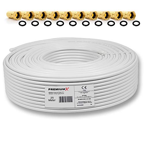 PremiumX Professionale Set Cavi Coassiali da 25m - Satkabel Bianco | Rame Puro | Antennenkabel Schermato 4-vie | 10 Connettori F Inclusi - Supporta 8K, 4K UHD & 3D per Sat, Cavo, DVB-T
