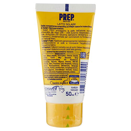 PREP, Latte Solare Dermoprotettivo SPF 50, Protezione Solare Raggi UVA e UVB, Senza Parabeni, Travel Size Formato 50 ml