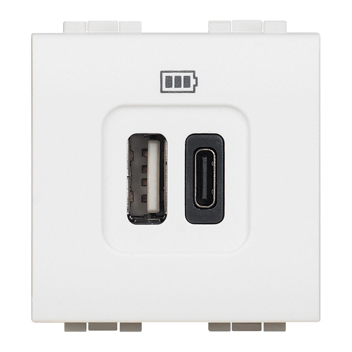 Caricatore USB tipo C con tensione 5 Vd.c. per la sola ricarica di dispositivi elettronici fino a 1.500mA - alimentazione DIRETTA 110-230 V 50-60 Hz - 1 modulo. Ricaricare dispositivi elettronici se sprovvisti di caricabatterie. Integrazione nelle scatole ad incasso. Minimo ingombro, collega il cavo USB alla presa senza bisogno di adattatori