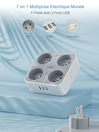 Presa Multi USB Tessan, Presa Multipla a Parete 4 Prese Francesi 4000W e 3 Porte USB