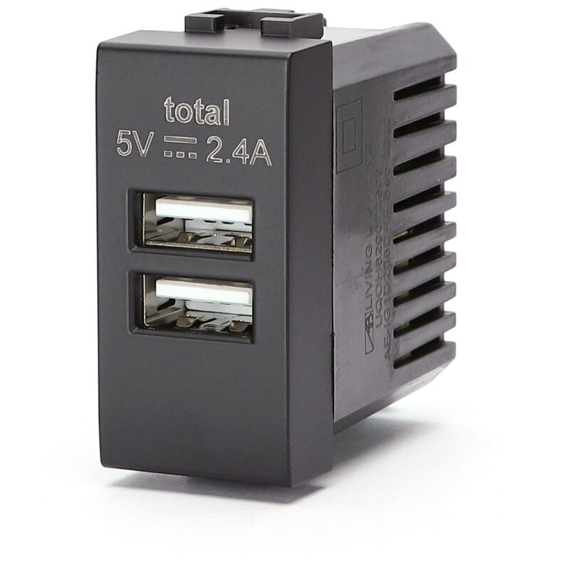 Il connettore USB 1 modulo 2 posti ad innesto 5V 2.4A, di colore nero, è compatibile con la serie civile BTicino Livinglight.
