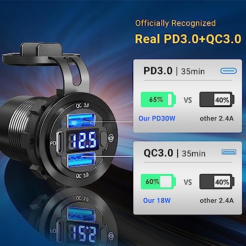 【Prese USB-C PD3.0】 La presa usb a 12 volt fornisce un'uscita massima di 30W per ogni porta USB C. La ricarica per iPhone 14/13/12/11/Pro Max/X/XR, iPad, AirPods, Tablet, Galaxy S21/S20/S10+ richiede solo 30 minuti da 0% a 65%. (Ricarica rapida per la serie iPhone: è necessario utilizzare il cavo USB C TO LIGHTNING.)PD3.0 è compatibile con QC4.0, QC3.0 e QC2.0 di Qualcomm.