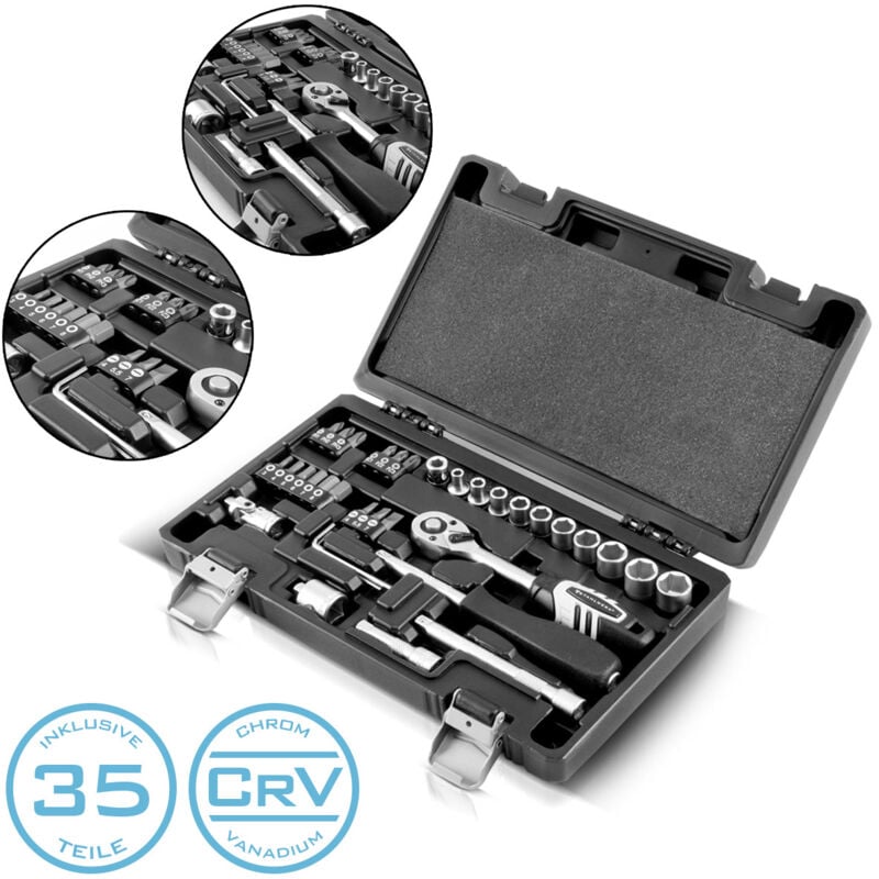 Caratteristiche Set di cricchetti universali e resistenti all'usura da 35 pezzi per uso professionale in officina, hobby e fai da te. Cricchetti reversibili di alta qualità con funzione di cricchetto (72 denti) per un gioco angolare ridotto durante il serraggio e l'allentamento delle viti. Punte e bussole in acciaio S2 in tutte le misure più comuni per tutti i tipi di applicazioni. Utensile ad alte prestazioni di qualità professionale, particolarmente indicato per l'industria, il commercio e l'artigianato. Finitura satinata di alta qualità in acciaio al cromo vanadio con impugnatura ergonomica bicomponente. Utensile premium con 7 anni di garanzia per le esigenze più elevate! Dati tecnici Materiale: acciaio al cromo vanadio Materiale punte: acciaio S2 Lunghezza punte: 25 mm Lunghezza cricchetto reversibile da 1/4 di pollice: 150 mm Peso totale: 935 g Contenuto della fornitura 10 prese da 1/4 di pollice: 4, 5, 6, 7, 8, 9, 10, 11, 12, 13 mm 2 prolunghe da 1/4 di pollice: 50, 100 mm 1 x