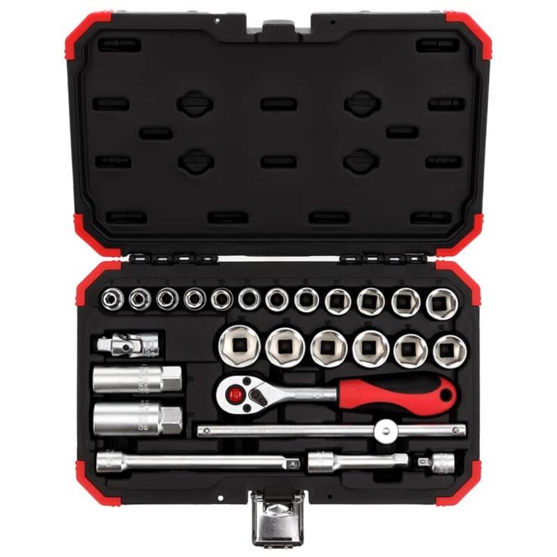 Inserti esagonali 6 7 8 9 10 11 12 13 14 15 16 17 18 19 20 21 22 24 mm, Bussola per candele 16 21 mm, Cricchetto reversibile a levetta, dentatura fine, 72 denti, Prolunga 75 150 mm, Impugnatura a T, Snodo cardanico, Adattatore 3/8 - 1/4, Misure: Alt 300 x L 180 x P 52 mm, Snodo a cardano 3/8, snodo avvitato, esecuzione a norma DIN 3123 - C 10, Bussola di riduzione da 3/8 a 1/4, Acciaio cromo-vanadio, satinato opaco cromato, Per avvitatura a mano, Valigetta in plastica nel design GEDORE red, Utensili assicurati a innesto, Cerniere/chiusura metallica Ci sono istruzioni per lo smaltimento sulla batteria? 0 Larghezza totale [mm] 302 mm Peso netto [kg] 2,44 kg Certificato VDE 0 Adattatore di trasmissione, quadrato [metrico] 10,0 mm Dimensioni dell'imballaggio 1 Contenuto (numero di pezzi) 26 tlg. Materiale (F) Chrom-Vanadium-Stahl Le istruzioni per lo smaltimento sono contenute nelle istruzioni per l'uso? 0 Altezza totale [mm] 54 mm Elenco dei pezzi (testo) 3/8 2K-Hebel-Umschaltknarre