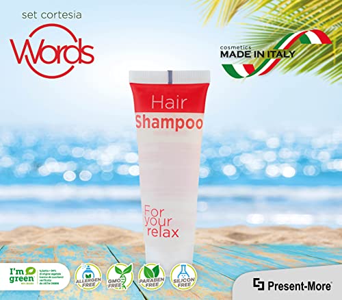 Present-More Shampoo 30ml Words - Shampoo monodose 210 pezzi per Alberghi, B&B e Hotel | Shampoo monodose privo di allergeni con fragranza Vigne Rouge